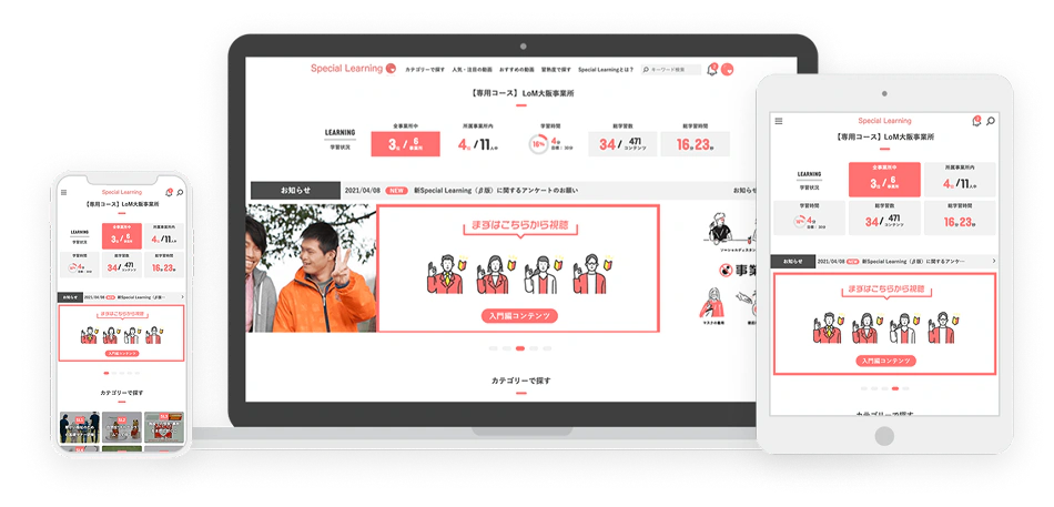 また、常勤、非常勤、管理者など一人一人の立場に合わせたコンテンツが選択可能。 より実践的に学習できるので、現場で活かせる知識が身につきます。