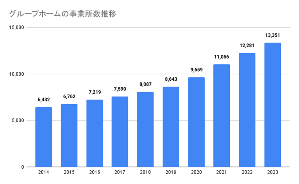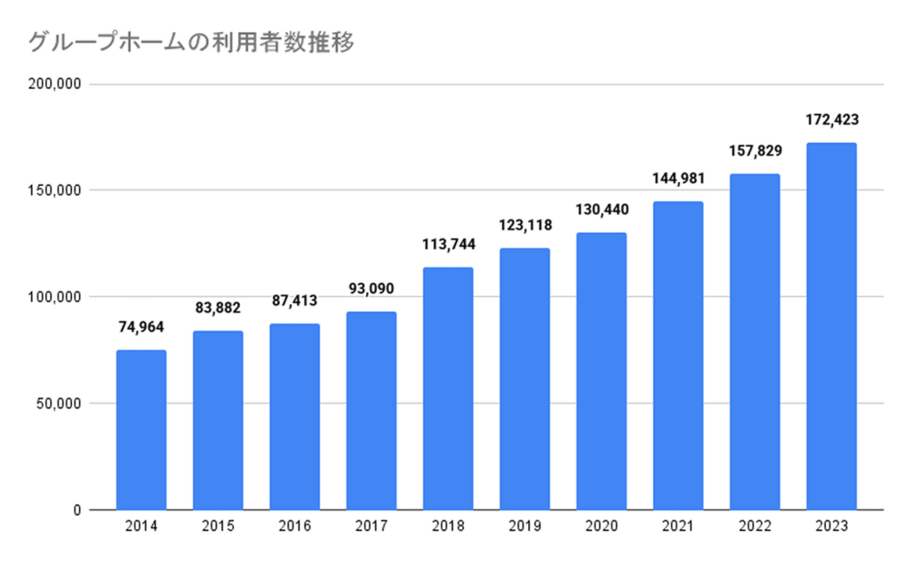 障がい者グループホーム(共同生活援助)の利用実人員数は、下記のグラフの通り2014年から2023年にかけて増加傾向にあり、継続的に需要が大きくなっていることがわかります。