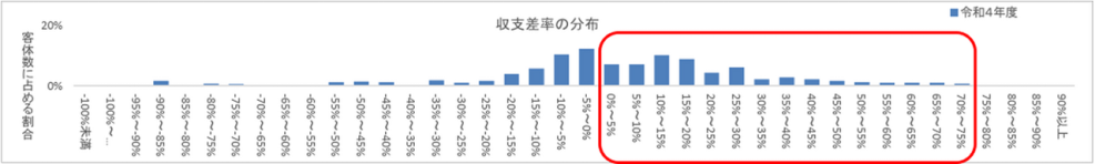 また、令和4年度の就労継続支援B型事業所の収支差率の分布を見ると、多くの事業所の収支差率が0%を上回っています。